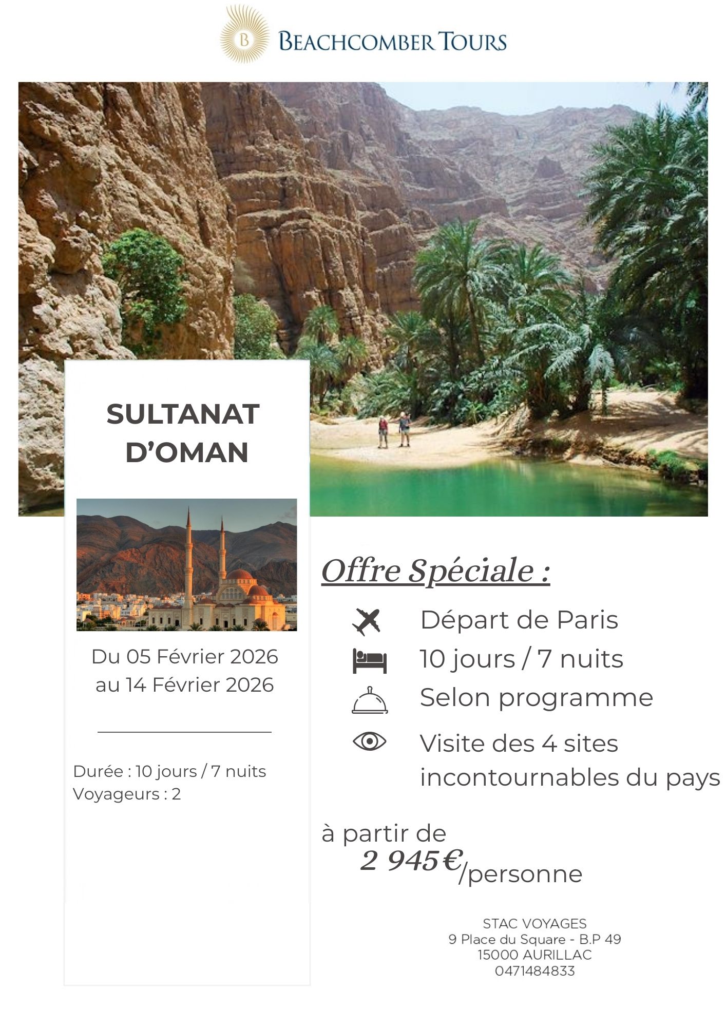 STAC VOYAGES à Aurillac vous propose un circuit privé ou en groupe pour découvrir tous les trésors d'Oman. Partez pour un circuit inoubliable à Oman, en petit groupe ou en voyage privé avec guide francophone. Découvrez Mascate et ses incontournables (Grande Mosquée, Opéra Royal, souks de Mutrah), puis prenez la route vers les montagnes Hajar, avec leurs villages perchés et leurs forts impressionnants comme Al Hazm et Nizwa. Parcourez les paysages spectaculaires du Jabal Akhdar, admirez les cultures en terrasses et explorez les wadis mythiques, dont le Wadi Bani Khalid et le Wadi Shab aux eaux turquoise. Dans le désert de Wahiba, vivez l’expérience unique d’une nuit sous les étoiles, entre dunes dorées, coucher de soleil en 4x4 et rencontre avec une famille bédouine. À Sur, célèbre pour ses chantiers navals, prolongez l’évasion jusqu’à Ras Al Jinz où vous assisterez au spectacle rare des tortues marines venant pondre sur la plage. Le voyage se termine par la route côtière offrant Bimah Sinkhole et des panoramas saisissants entre mer et montagnes. Un circuit idéal pour plonger au cœur de l’authenticité omanaise, entre culture, nature et traditions.