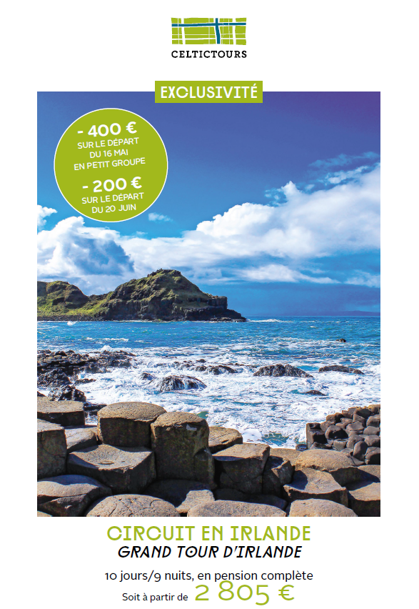Vous découvrirez ensuite les falaises de Moher, qui dominent l’Atlantique à plus de 200 mètres de hauteur, avant de traverser le paysage unique du Burren, célèbre pour son plateau calcaire et son dolmen préhistorique de Poulnabrone. Le voyage continue vers Galway et le Connemara, région mythique aux landes sauvages, montagnes rocailleuses et tourbières infinies. Dans le nord de l’île, explorez le Donegal, l’une des régions les plus sauvages d’Irlande, avant de rejoindre l’Irlande du Nord pour admirer la spectaculaire Chaussée des Géants, site naturel classé au patrimoine mondial de l’UNESCO. Votre aventure se termine à Belfast, avec la visite du célèbre musée Titanic, retraçant l’histoire du mythique paquebot construit dans la ville. Ce Grand Tour d’Irlande vous promet un voyage complet entre nature grandiose, patrimoine historique et traditions irlandaises, à la découverte des plus beaux sites de l’île d’émeraude. |