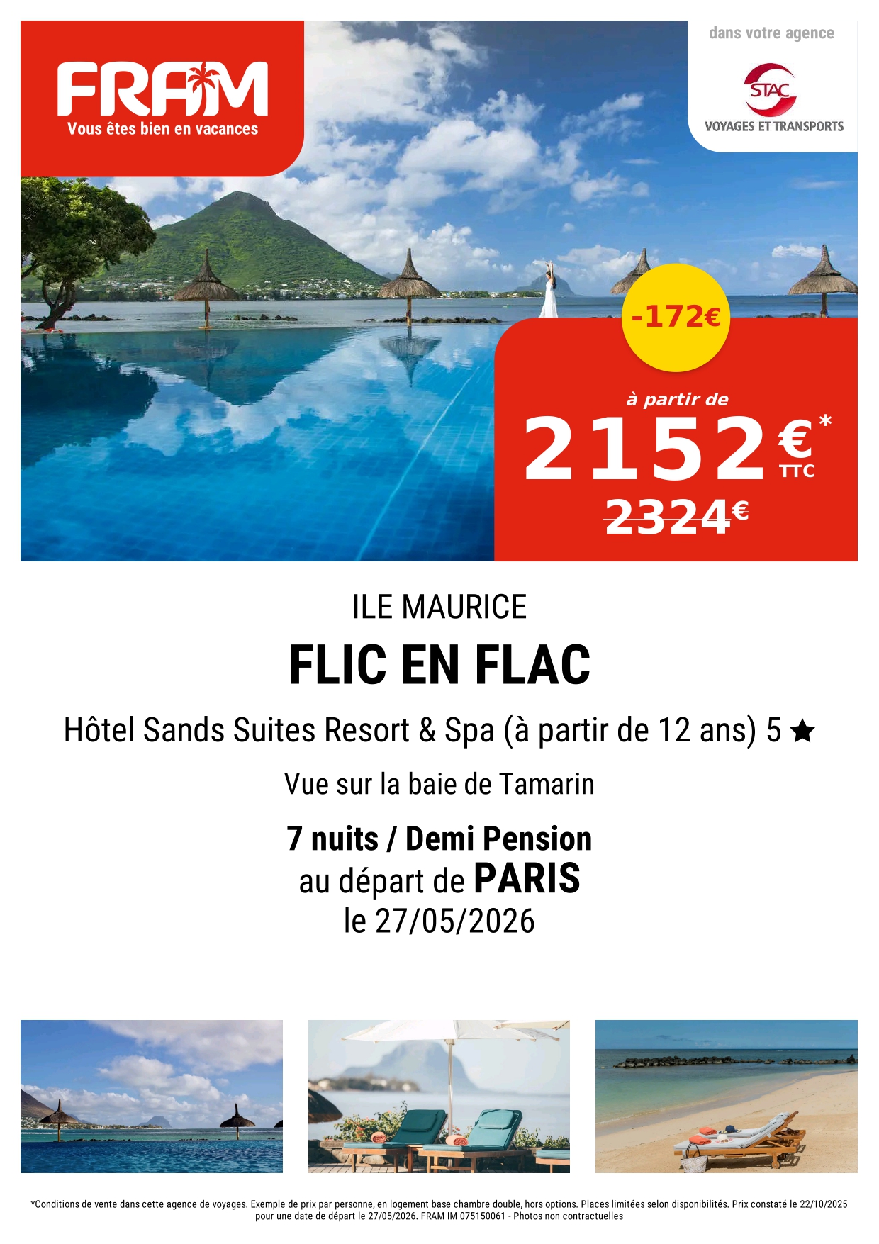 STAC Voyages à Aurillac vous propose un séjour de rêve à l’Île Maurice au Sands Suites Resort & Spa 5★. Ventes Flash du 22 octobre au 02 novembre 2025 Découvrez l’Île Maurice, véritable joyau de l’océan Indien, où terre et mer s’unissent pour offrir un cadre d’exception. Entre plages de sable blanc, eaux turquoise protégées par des récifs coralliens, végétation luxuriante et champs de canne à sucre et de thé, l’île séduit par la richesse de sa culture métissée. Temples hindous et tamouls, mosquées et églises cohabitent harmonieusement, tandis que les merveilles naturelles comme les cendres colorées de Chamarel, la réserve des Gorges de Rivière Noire, le Parc aux crocodiles de Vanille ou les Falaises de Gris-Gris offrent des expériences inoubliables. Adaptée à toutes les envies, l’Île Maurice est une destination idéale pour les plongeurs, kite-surfeurs, golfeurs ou amateurs de farniente, le tout agrémenté de la chaleur et de l’hospitalité légendaire des Mauriciens. Offrez-vous un séjour d’exception au Sands Suites Resort & Spa 5★, niché sur la côte ouest de l’île, sur la superbe plage de Flic-en-Flac. Surplombant les eaux de la Baie de Tamarin et la majestueuse péninsule du Morne, ce hôtel certifié Green Globe propose un cadre intime et reposant, idéal pour la détente et la sérénité. Inspiré du charme local, il offre des suites élégantes, des espaces bien-être, et un environnement tropical privilégié, pour un séjour raffiné à Maurice. Situé à 5 km de Flic-en-Flac, 30 km de Port-Louis et 35 km du Morne, le resort est accessible en 1h depuis l’aéroport (50 km). Réservé aux adultes à partir de 12 ans, le Sands Suites Resort & Spa 5★ est le choix parfait pour un séjour haut de gamme, entre plage, luxe et découverte culturelle. Nos avis voyageurs : 4.8 / 5 |