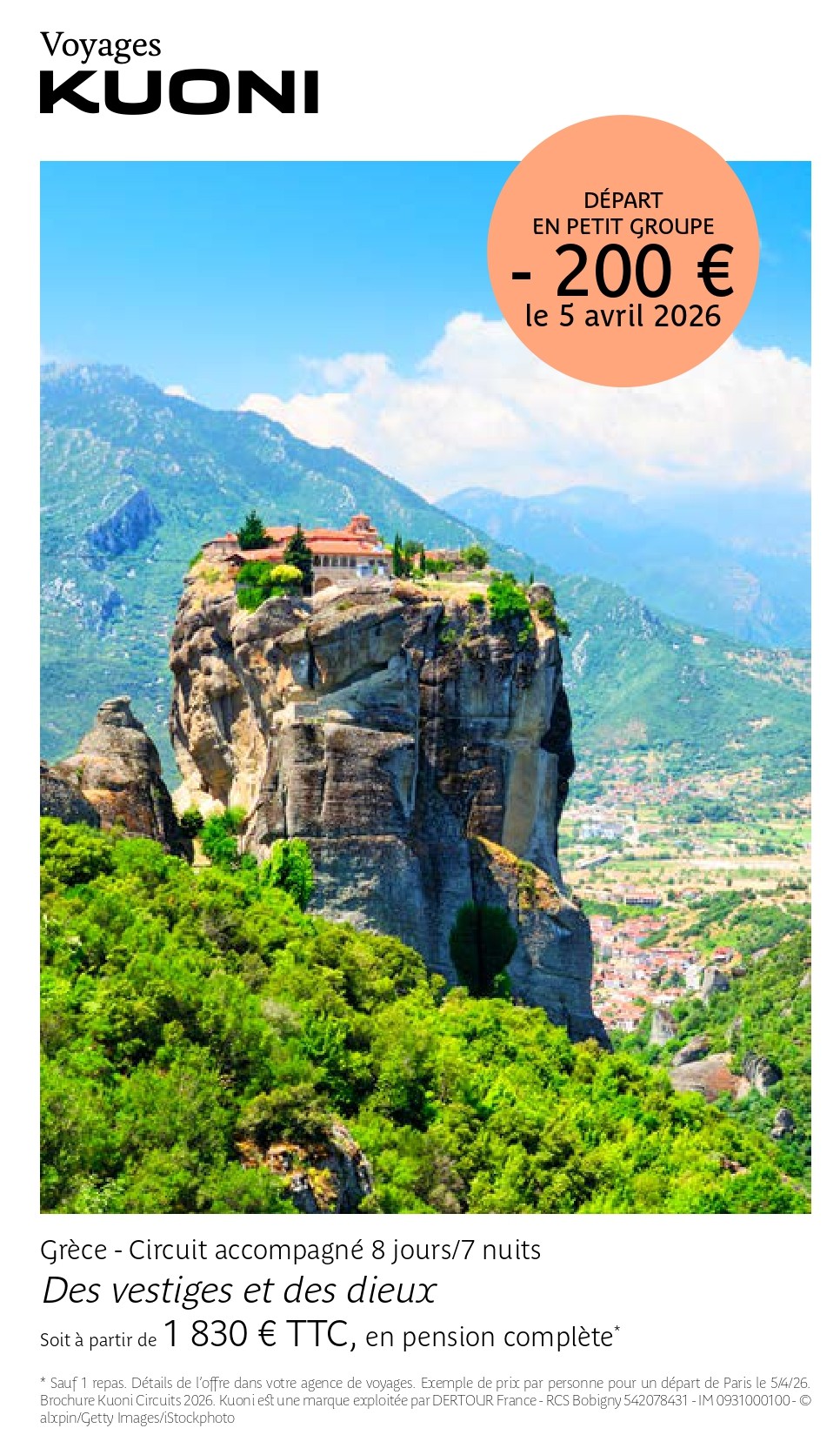 STAC Voyages à Aurillac vous propose le Circuit Vestiges et Dieux – 8 jours/7 nuits – en Grèce Jusqu'à - 200 € sur le départ du 05 Avril 2026 Ce circuit vous plonge au cœur de la Grèce antique, berceau de la civilisation occidentale, à la découverte de ses plus grands sites historiques et archéologiques. D’Athènes et sa mythique Acropole aux paysages majestueux du Péloponnèse, en passant par Delphes et les spectaculaires monastères des Météores, ce voyage offre une immersion complète dans l’histoire, la mythologie et les paysages grecs. Vous explorerez les sites majeurs classés au patrimoine mondial de l’UNESCO : l’Acropole d’Athènes, les sanctuaires d’Épidaure et de Delphes, la cité légendaire de Mycènes, le site d’Olympie – berceau des Jeux olympiques – sans oublier Mystras et les impressionnants monastères des Météores perchés sur leurs pitons rocheux. Entre visites culturelles, panoramas saisissants, villages typiques et découvertes gastronomiques, ce circuit mêle harmonieusement patrimoine, paysages et traditions locales. Un voyage riche et complet, sur les traces de Platon, Aristote et des dieux de l’Olympe, idéal pour les amateurs d’histoire, de culture et de civilisations antiques. |